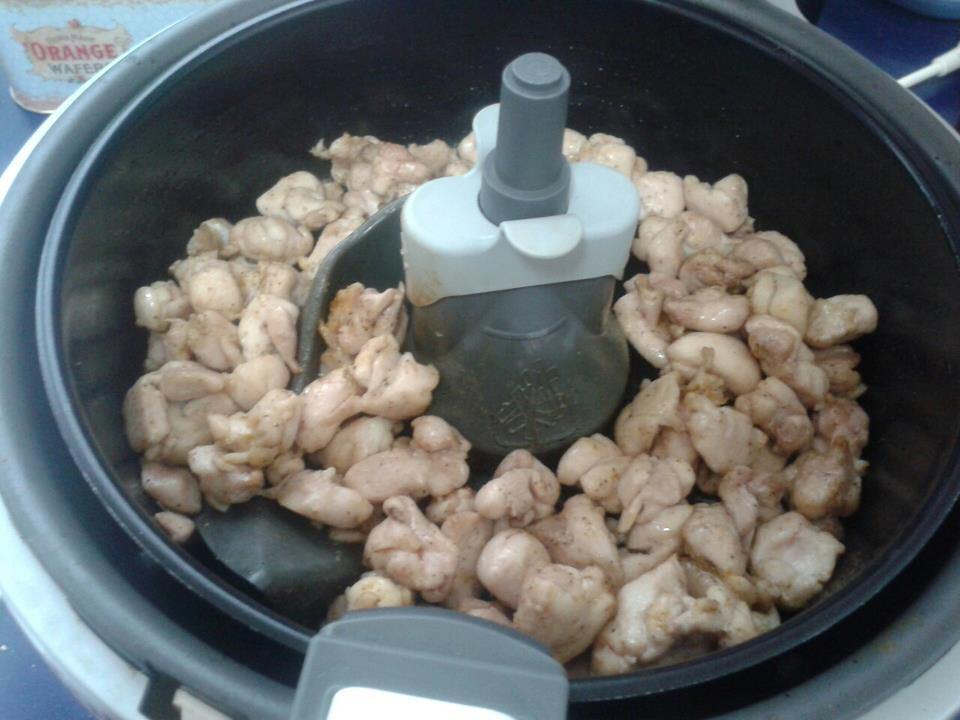 Lo primero debemos tener los muslos de pollo deshuesados, sin piel y picados en trozos pequeñitos.